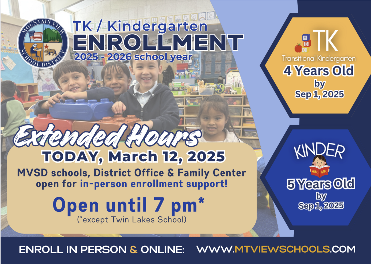 If you need assistance with your child's TK/Kinder enrollment, our school staff will be available to support our families for extended hours, in-person on the following days: